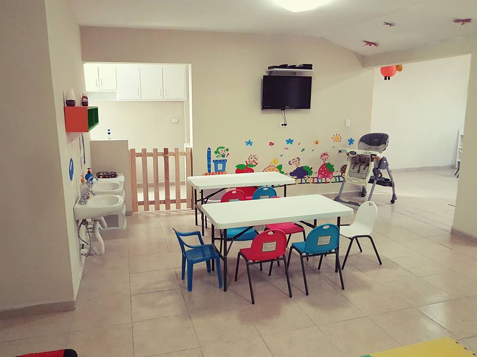 La sala principal es un entorno cálido, alegre y lleno de color, diseñado especialmente para el desarrollo y convivencia de los niños. Con mobiliario adaptado a su tamaño, lavabos accesibles y una decoración con motivos infantiles, este espacio invita al juego, la creatividad y el aprendizaje. Las mesas, sillas y la silla alta brindan comodidad tanto para actividades educativas como para la hora de la comida.